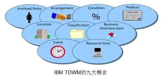 举例来说,IBM 的 TDWM 的模型总共包含了以下 9 个概念,如下图: