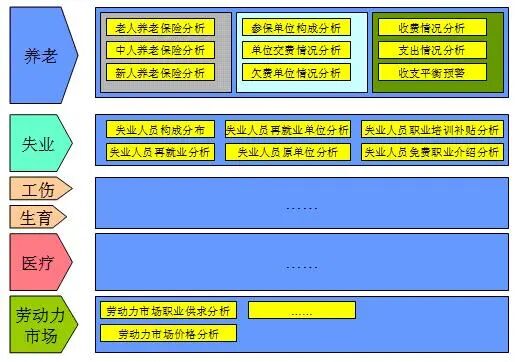 在这里,我们将整个业务很清楚地划分成了几个大的业务主线,例如:养老,失业,工伤,生育,医疗,劳动力等着几个大的部分,然后我们可以根据这些大的模块,在每个业务主线内,考虑具体的业务主线内需要分析的业务主题。
