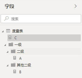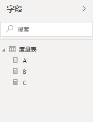 假设你有一个名为度量的表,其中包含三个度量,分别称为A,B和C。这是默认情况下在Power BI Desktop的“字段”窗格中的外观: