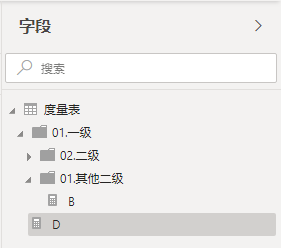 再举一个例子,如果在B度量的“显示文件夹”属性输入“一级\其他二级”的,则结果是: