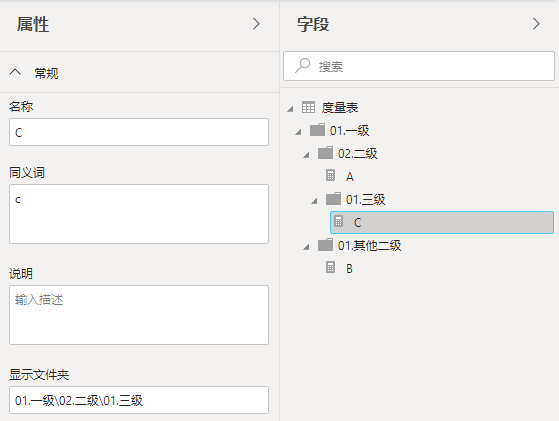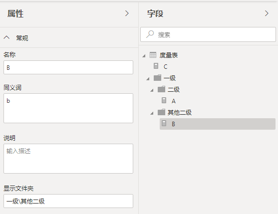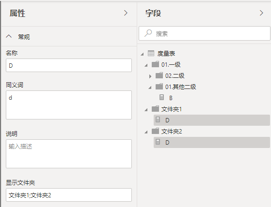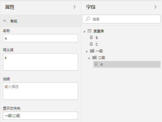 当然,你还可以创建嵌套的显示文件夹,你可以通过在显示文件夹属性中输入多个文件夹名称(用反斜杠\字符分隔)来创建一层层的嵌套文件夹。例如,在A度量的显示文件夹中输入“一级\二级”,如下所示: