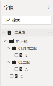 刚刚只是让文件夹有两个层次,同样的方法可以让文件夹有三个或者更多层次,在C度量的“显示文件夹“属性中输入“01.一级\02.二级\01.三级”则结果是: