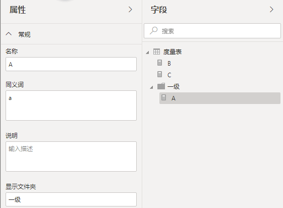 如果你在“字段”窗格中选择列A,然后在新建模视图的“显示文件夹”属性中输入名称(在本例中为“一级”),你将看到“度量A”现在显示在“字段”窗格中的文件夹中: