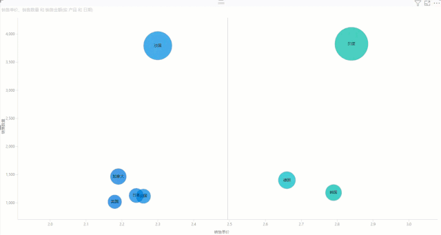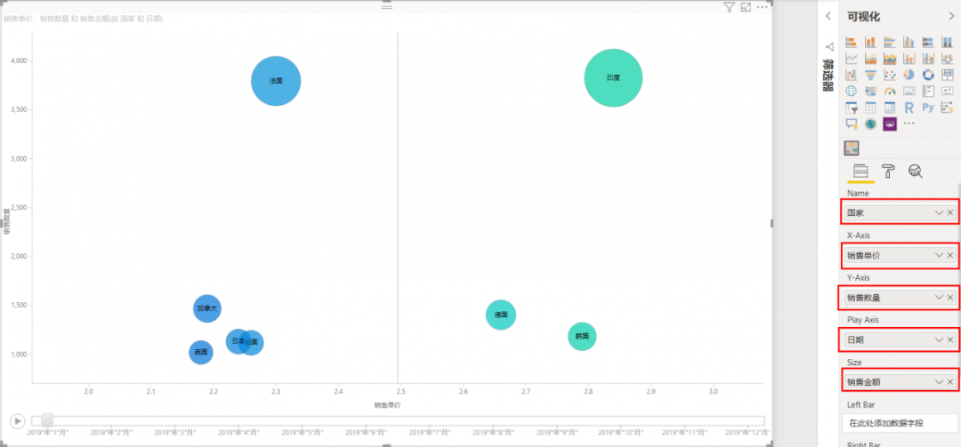 拖动下方的日期滑块,我们可以看到一些轨迹,这些轨迹说明了随着销售单价的变化,各个国家的销售数据是如何随之变动的。