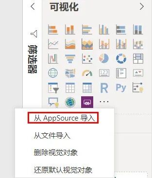 在可视化页签上选择“…”,然后在弹出窗口选择“从AppSource导入”。