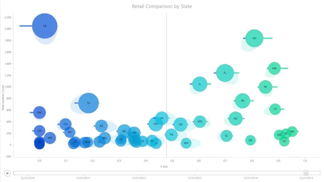 使用气泡在X / Y空间中的位置,以及可选的左右栏,可以将此图表用于比较任一实体的相对数据。此图表独特的是,每个气泡上的“尾部”都指示与上一个数据点相比数据发生了变化(请参见下面的“播放轴”)。