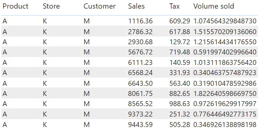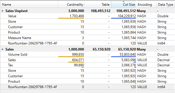 首先,请注意Sales Unpivot表(使用度量维度方法)比Sales表大66%。还请注意,在Sales表中,“Sales”和“Tax” 度量列(包含货币值)可以使用通用数据类型(此处显示为Decimal,十进制),这意味着它们可以使用值编码;只有“Volume Sold”列需要使用十进位(制)数据类型(在这里显示为Double)存储,并且必须使用哈希编码。由于Sales表中存储的所有数值都是用十进制编码列存储的。正如本文所解释的,值编码可以给你带来很多性能上的好处。