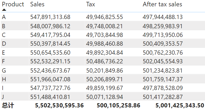 当我们开始构建更复杂的DAX计算时,度量维度方法的缺点变得更加明显。假设我们希望报表中有一个显示“Sales”、“Tax”和从销售额中减去税款的指标,称为税后销售额: