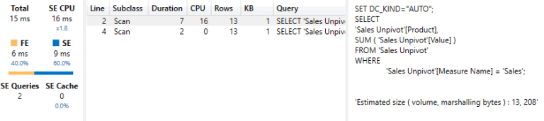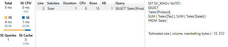 顺便提醒下只有一个存储引擎查询:DAX fusion已启用,因此可以在同一扫描中检索所需的Sales和Tax值。