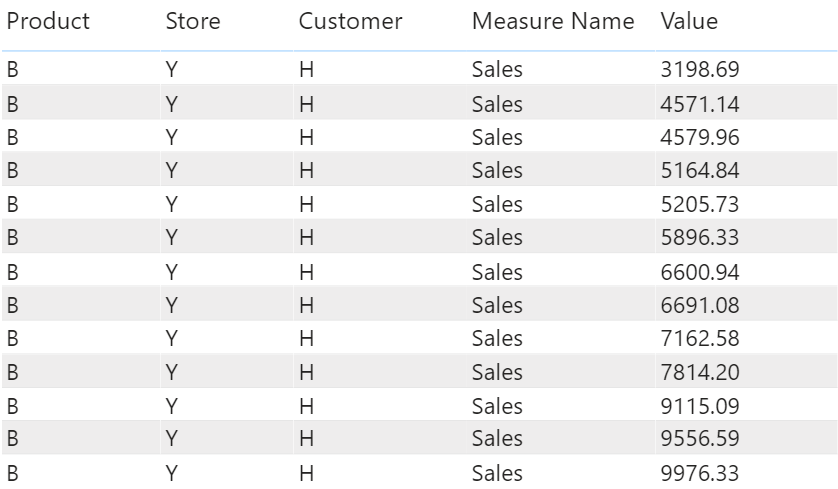 不过,我们经常会看到有人是这样来对事实表进行建模:不取消数据透视的每个度量的单独列,而是在事实表中为每个度量值创建一行,使用一个列来存储所有度量值并创建一个新维度,以允许用户选择所需的度量值。这是另一个事实表的示例,称为Sales Unpivot,显示了如何使用此技术来重构来自上面Sales事实表的数据:
