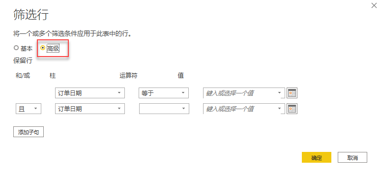 配置完两行后,现在在“筛选行”窗口中看到以下内容