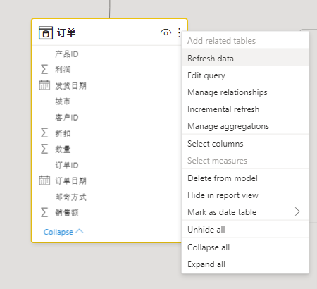 Power BI还添加了一些选项,可以立即展开和折叠模型图中的所有表卡。你可以通过几种不同的方式执行此操作。你可以右键单击图表中的表格卡,或单击更多选项按钮以获取全部折叠和展开所有选项。
