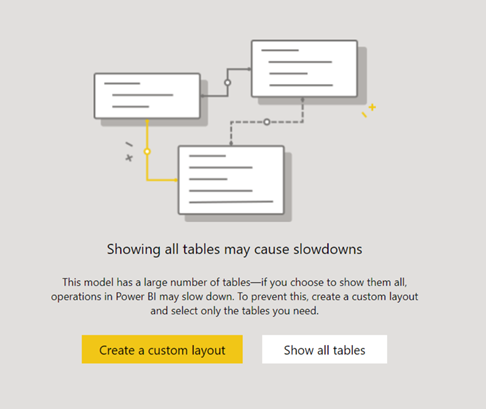 如果要跳过阈值,可以按“显示所有表”。但是,强烈建议不要这样做,因为这可能会导致Power BI消耗大量内存,CPU周期并显着降低速度。相反,如果你要修改图表,建议你创建布局并一次使用较少数量的表。