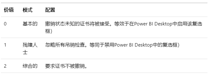 若要今天使用更细粒度的控件而不必等待用户界面更改,请设置以下DWORD注册表值:DisableCertificateRevocationCheck。你将需要在Power BI Desktop的注册表项中进行设置,具体取决于系统配置,该注册表项为HKEY_LOCAL_MACHINE\SOFTWARE\WOW6432Node\Microsoft\ Microsoft Power BI Desktop或HKEY_LOCAL_MACHINE\SOFTWARE\ Microsoft\Microsoft Power BI Desktop。