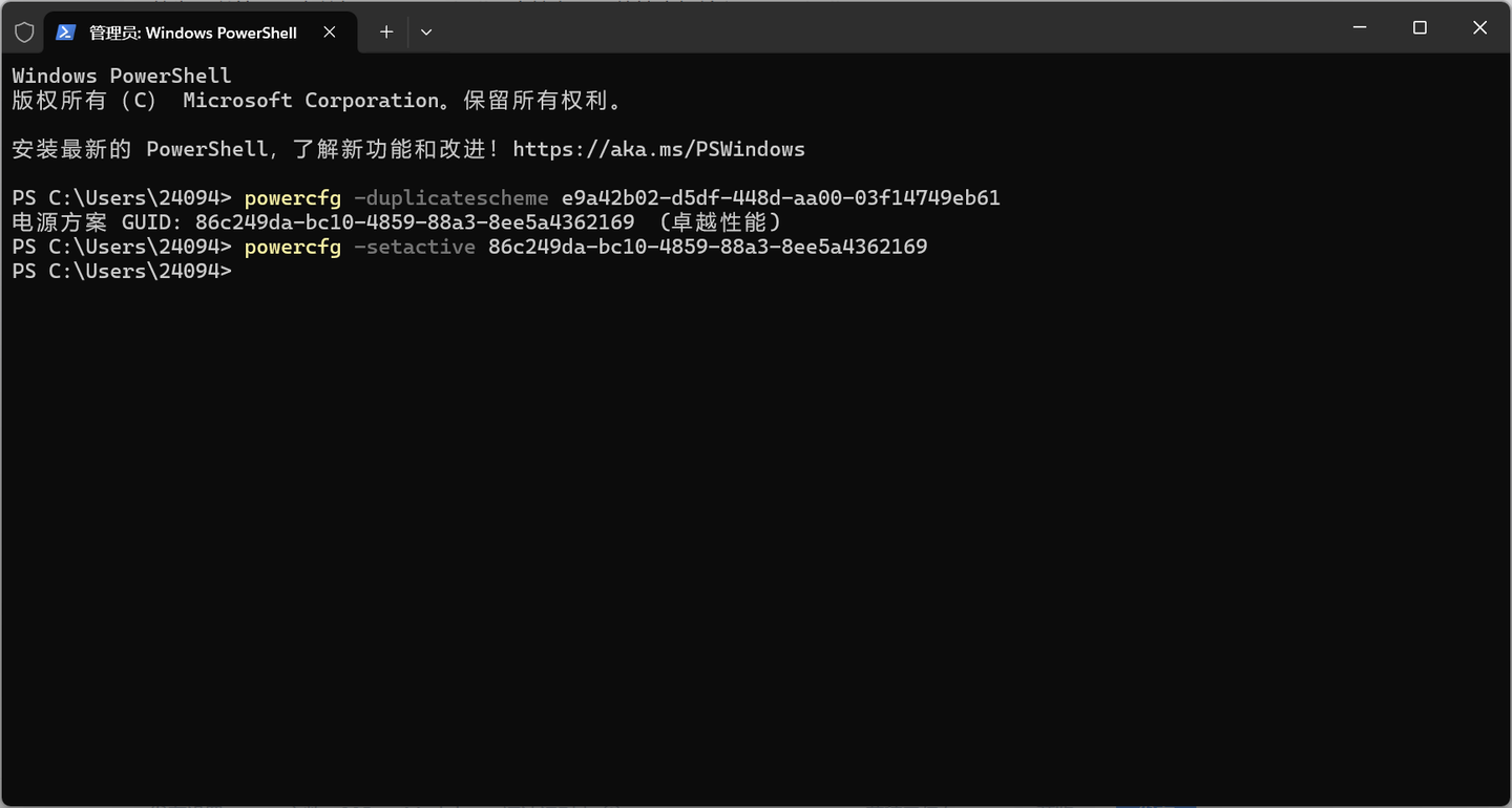PS C:\Users\24094> powercfg -duplicatescheme e9a42b02-d5df-448d-aa00-03f14749eb61