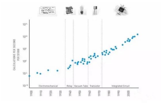 而我们这个时代的技术爆炸,往往是指数级发展的。比如摩尔定律预测,计算能力每18到24个月会翻一倍。下面这幅图来自《奇点临近》这本书: