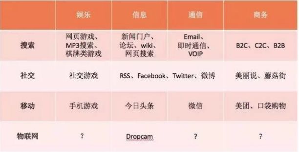 “四纵”为娱乐、信息、通信、商务四大领域,而“三横”是说每五年左右,会有一个大的技术变革,逐渐影响这四个领域,四纵三横的交汇处就会有不同的机会。(王兴最后又在自己的总结上加了一个预测,也就是未来的“物联网”发展,所以图示其实是凑成了四纵四横,其他的三横分别是搜索、社交、移动)