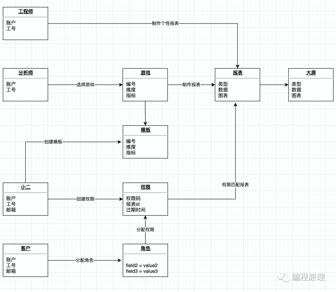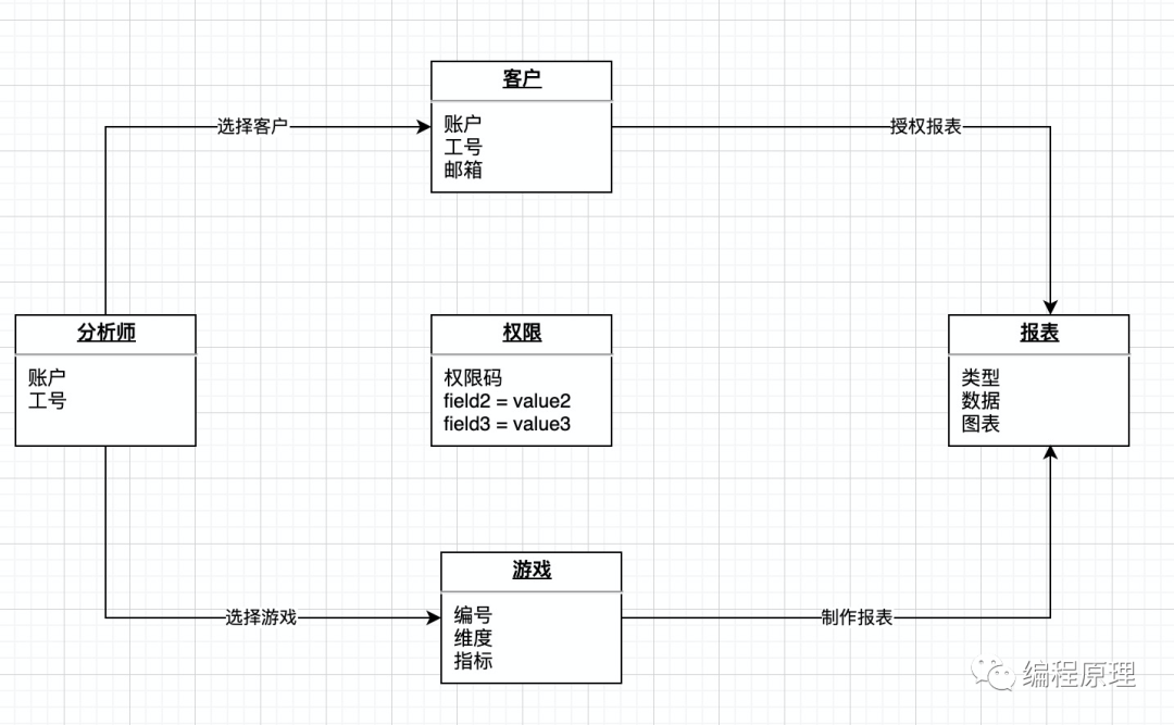 首先我们分析项目在领域分层后的概念项目涉及到的名词:分析师,工程师,客户,小二报表,报表模板,权限,角色,告警,人群,活动,决策动词:登陆,创建权限,匹配权限,授权,建表,圈人,营销