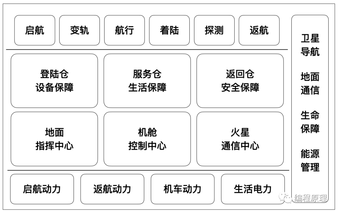 好了,现在我们知道了概念这个工具的重要性和功能,前面我们已经列举了登陆火星要做的事情,那么现在就需要精确简洁的把这件事给说清楚了,这个是个困难的任务,因为如果主线没有梳理清晰,后面整个工程将万劫不复。在业务建模后就是概念建模,作为架构设计的输入,这个阶段就需要对核心业务的充分理解,同时在基础性和通用性方面的功能也需要同时考虑,这个阶段需要大量的业务专家和各个领域的科学家通力协作,保证对系统的理解没有偏差。经过一系列的概念抽象和组合,最终输出登陆火星工程的架构图,这里只是用于说明登陆火星项目同样遵循这业务-概念-架构-设计的流程,不要在意架构图本身合不合理。