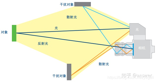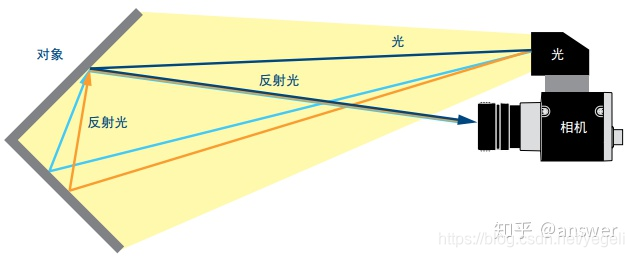 距离测量要求光只反射一次。但是镜面或者一些角落会导致光线的多次反射,这会导致测量失真。如果多重反射使得光线完全偏转,则没有反射光线进入相机,从而无法正确测量反射面的距离。反之,如果其他方向的光通过镜面反射进入芯片,则可能会发生过度曝光。见下图。