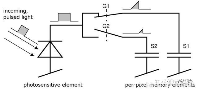 照射光源一般采用方波脉冲调制,这是因为它用数字电路来实现相对容易。深度相机的每个像素都是由一个感光单元(如光电二极管)组成,它可以将入射光转换为电流,感光单元连接着多个高频转换开关(下图的G1,G2)可以把电流导入不同的可以储存电荷(下图S1,S2)的电容里。
