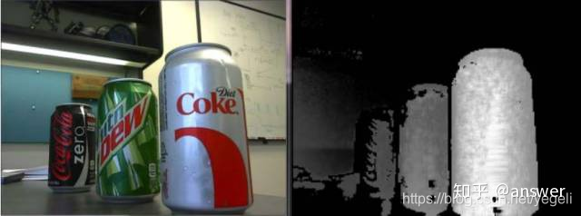 TOF相机内部每个像素经过上述过程都可以得到一个对应的距离,所有的像素点测量的距离就构成了一幅深度图,如下图所示。左边是原图,右边是对应的深度图。