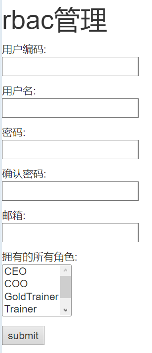 class user_role_form(ModelForm): eid=forms.CharField(label='用户编码',validators=[RegexValidator(r'^(E|H)\d{6}$')]) password=forms.CharField(label='密码',widget=forms.PasswordInput()) confirm_pwd=forms.CharField(label='确认密码',widget=forms.PasswordInput()) class Meta: model=models.UserInfo fields='__all__'