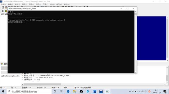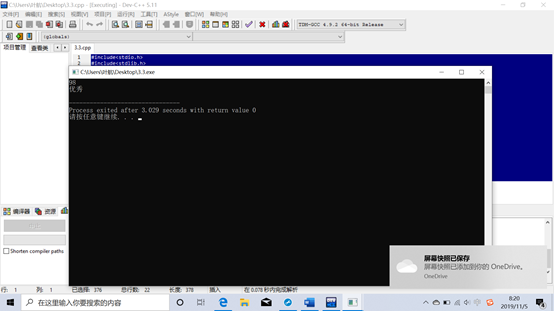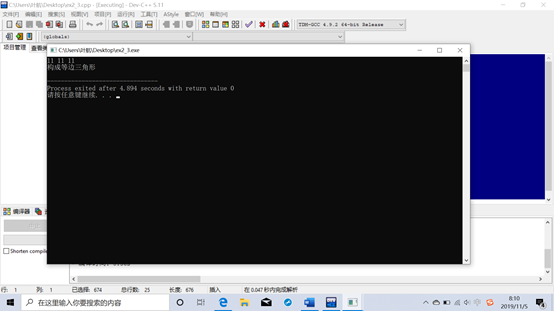 /* 《C语言程序设计教程学习指导》p122 实验内容(1):判断三角形类型:一般三角形、等腰三角形、等边三角形 这是一个使用多分支if语句编程解决非数值类问题示例 运行程序,输入不同边长数据进行测试,观察输出结果是否正确,理解和巩固if语句功能和用法 */ #include <stdio.h> int main() { double a,b,c; scanf("%lf %lf %lf", &a, &b, &c); if(a<0 || b<0 || c<0) printf("不能构成三角形\n"); else if(a+b>c && a+c>b && b+c>a) { if(a==b && a==c) printf("构成等边三角形\n"); else if(a==b || a==c || b==c) printf("构成等腰三角形\n"); else printf("构成一般三角形\n"); } else printf("不能构成三角形\n"); return 0; }