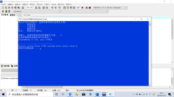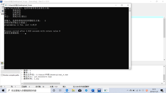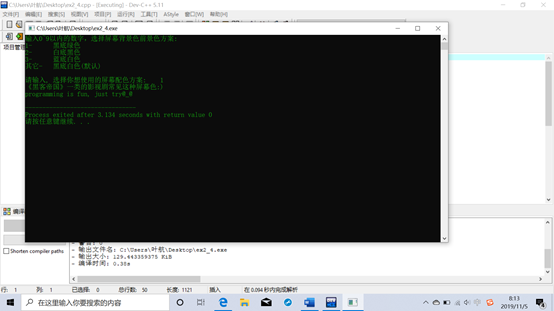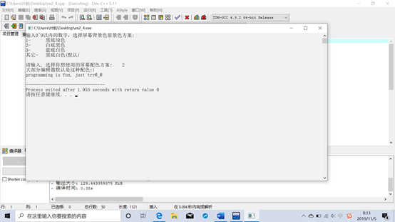 // 功能: 从键盘上输入数字选择屏幕配色方案,打印字符串 // 输入1, 选择黑底绿色配色方案 // 输入2,选择白底黑色配色方案 // 输入3,选择蓝底黑色配色方案 // 输入其它,选择黑底白字配色方案(默认) #include <stdio.h> #include <stdlib.h> int main() { char choice; // 显示菜单 printf("输入0~9以内的数字,选择屏幕背景色前景色方案: \n"); printf("1-\t黑底绿色\n"); printf("2-\t白底黑色\n"); printf("3-\t蓝底白色\n"); printf("其它-\t黑底白色(默认)\n"); printf("\n请输入, 选择你想使用的屏幕配色方案: "); // 要求用户从键盘输入0~9的数字,选择屏幕配色方案 choice = getchar(); // 根据用户输入,设置屏幕配色方案 if (choice == '1') { system("color 02"); printf("《黑客帝国》一类的影视剧常见这种屏幕色:)\n"); } else if(choice == '2') { system("color f0"); printf("大部分编辑器默认是这种配色:)\n"); }