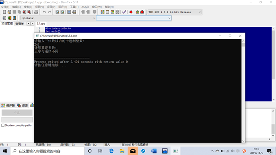 #include<stdio.h> int main() { int x,y; printf("请输入三位数以内的十进制整数:\n"); scanf("%d",&x); printf("计算其逆系数:\n"); if(x<0||x>999) {printf("数据输入错误,请重新输入:\n"); } if(0<=x&&x<=9) { printf("正序与逆序相同\n"); } if(10<=x&&x<=99) {y=(x%10*10+x/10); if(x==y) printf("正序与逆序相同\n"); else printf("正序与逆序不同\n"); } if(100<=x&&x<=999) {y=(x%10*100+x/10%10*10+x/100); if(x==y) printf("正序与逆序相同\n"); else printf("正序与逆序不同\n"); } return 0 ; }