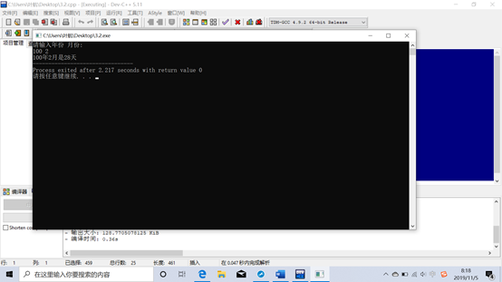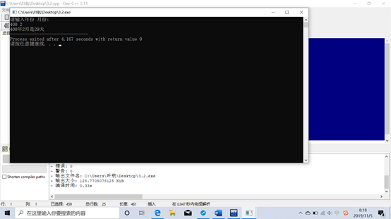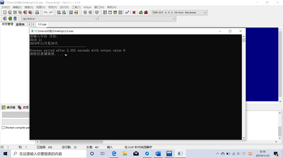 #include<stdio.h> int main() {int y,m; printf("请输入年份 月份:\n"); scanf("%d",&y); scanf("%d",&m); if(y<=0||m<=0||m>12) { printf("数据输入错误,请重新输入:\n");} if(m==1||m==3||m==5||m==7||m==8||m==10||m==12) { printf("%d年%d月是31天",y,m);} if(m==4||m==6||m==9||m==11) { printf("%d年%d月是30天",y,m);} if(m==2) {if((y%4==0)&&(y%100!=0)||(y%400==0)) printf("%d年%d月是29天",y,m); else printf("%d年%d月是28天",y,m); } return 0; }