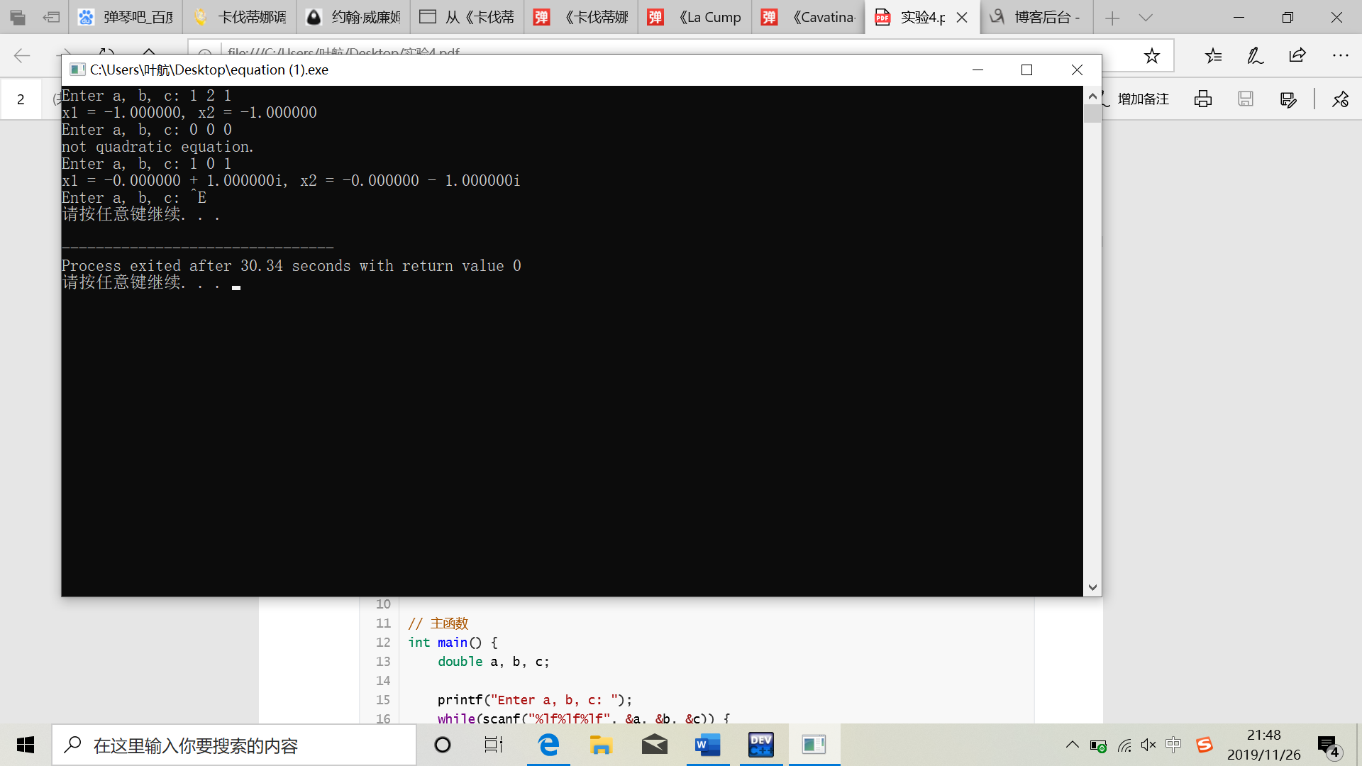 #include <math.h> #include <stdio.h> #include <stdlib.h> // 函数声明 void solve(double a, double b, double c); // 主函数 int main() { double a, b, c; printf("Enter a, b, c: "); while(scanf("%lf%lf%lf", &a, &b, &c)) { solve(a, b, c); // 函数调用 printf("Enter a, b, c: "); } system("pause"); return 0; } // 函数定义 // 功能:求解一元二次方程,打印输出结果 // 形式参数:a,b,c为一元二次方程系数 void solve(double a, double b, double c) { double x1, x2; double delta, real, imag; if(a == 0) printf("not quadratic equation.\n"); else { delta = b*b - 4*a*c; if(delta >= 0) { x1 = (-b + sqrt(delta)) / (2*a); x2 = (-b - sqrt(delta)) / (2*a); printf("x1 = %f, x2 = %f\n", x1, x2); } else { real = -b/(2*a); imag = sqrt(-delta) / (2*a); printf("x1 = %f + %fi, x2 = %f - %fi\n", real, imag, real, imag); } } }