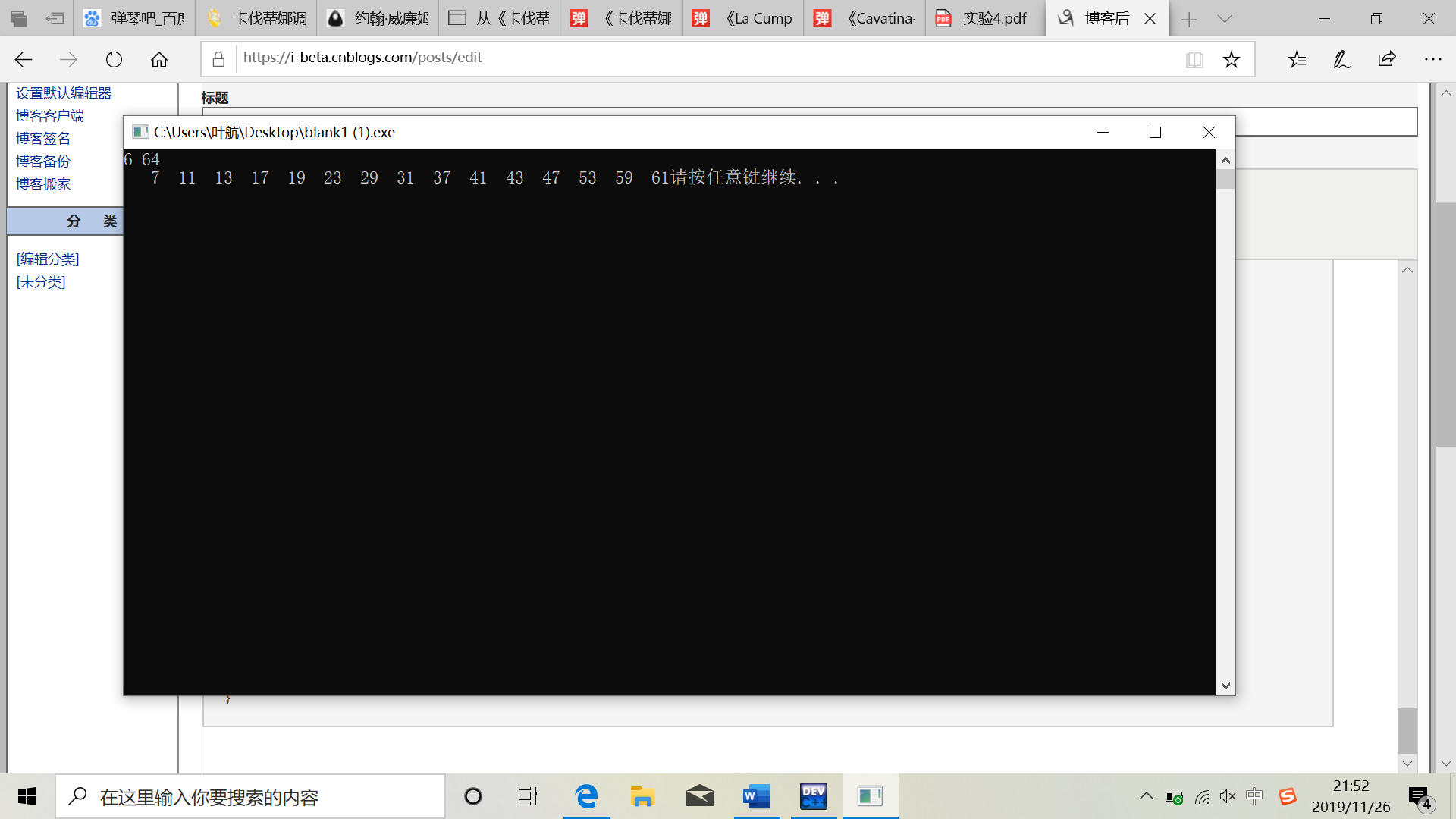 //寻找两个整数之间的所有素数(包括这两个整数),把结果保存在数组bb中,函数返回素数的个数。 // 例如,输入6和21,则输出为:7 11 13 17 19。 #include <stdio.h> #include <stdlib.h> #define N 1000 int fun(int n,int m,int bb[N]) { int i,j,k=0,flag; for(j=n;j<=m;j++) { flag=1; for(i=2;i<j;i++) if(j%i==0) { flag=0; break; } if(flag) bb[k++]=j; } return k; } int main(){ int n=0,m=0,i,k,bb[N]; scanf("%d",&n); scanf("%d",&m); for(i=0;i<m-n;i++) bb[i]=0; k=fun(n,m,bb); for(i=0;i<k;i++) printf("%4d",bb[i]); system("pause"); return 0; }