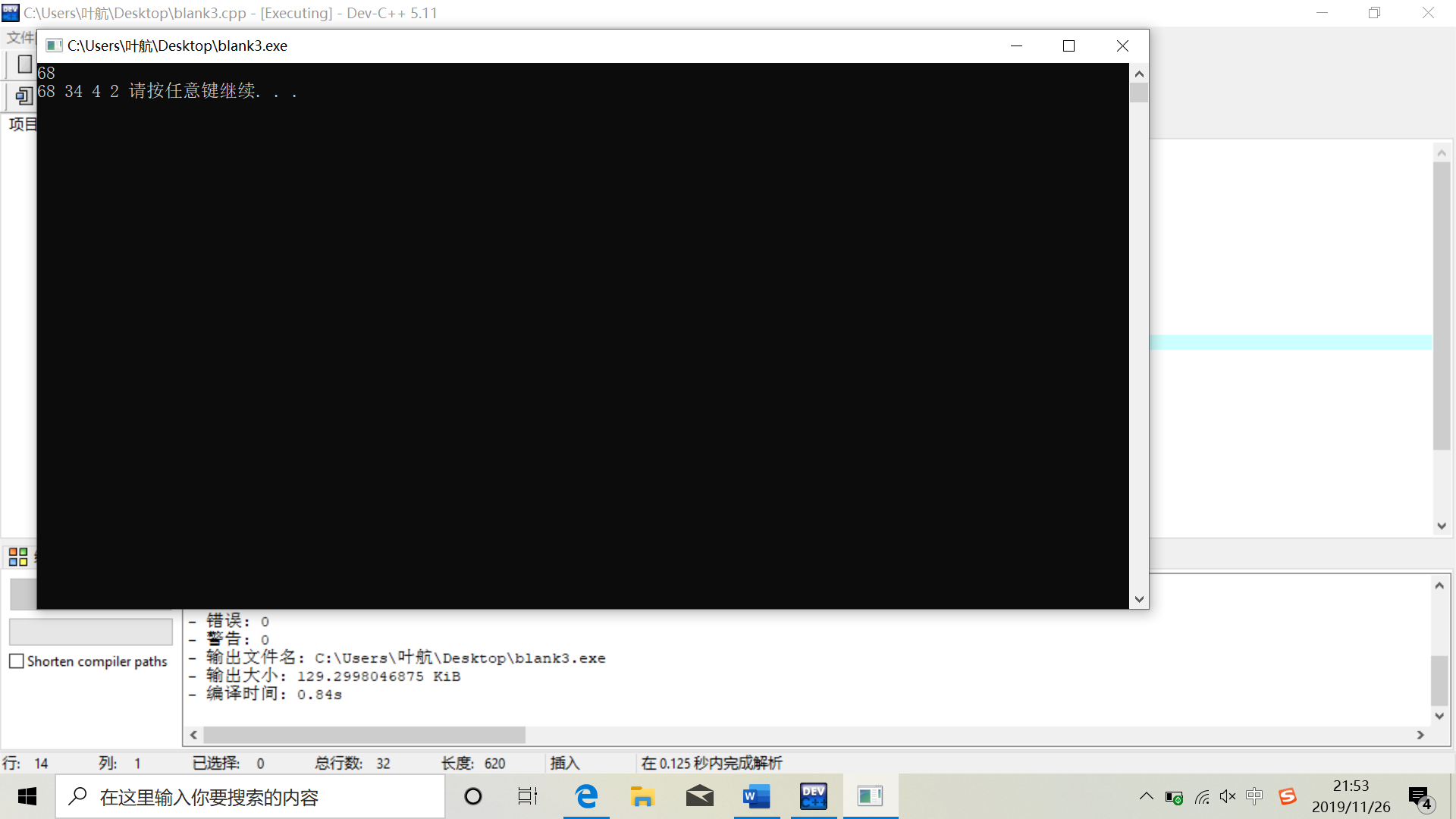 // 函数fun()的功能是: 找出能够被x整除并且是偶数的数, // 把这些数保存在数组bb中,并按从大到小的顺序输出。 // 例如,当x=20时,依次输出: 20 10 4 2。 #include <stdio.h> #include <stdlib.h> void fun(int k,int bb[]) { int i; int j=0; for(i=2; i<=k; i++) { if( i%2==0&&k%i==0 ) bb[j++]=i; } for(i=j-1; i>=0; i--) // blank3 printf("%d ",bb[i]); } int main() { int x, *t; scanf("%d", &x); // 向系统申请sizeof(int)*x个字节的内存空间 // 如果申请成功,将系统分配的内存的首地址赋值给t t = (int *) malloc(sizeof(int)*x); fun(x,t); system("pause"); return 0; }