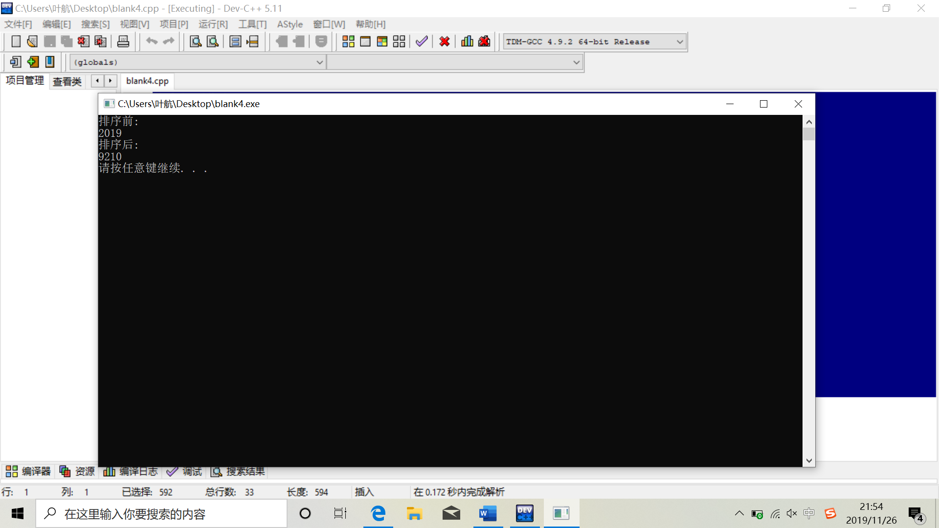 #include <stdio.h> #include <stdlib.h> const int N=4; void output(char x[], int n); void com(char x[],int n) ; int main() { char string[N] = {'2','0','1','9'}; int i; printf("排序前: \n"); output(string, N); com(string,N); printf("\n排序后: \n"); output(string, N); printf("\n"); system("pause"); return 0; } void output(char x[], int N) { int i; for(i=0; i<N; i++) printf("%c", x[i]); } void com(char x[],int N){ int j,i,t; for(j=0;j<N-1;j++) for(i=0;i<N-j-1;i++) if(x[i]<x[i+1]) {t=x[i]; x[i]=x[i+1]; x[i+1]=t; } }