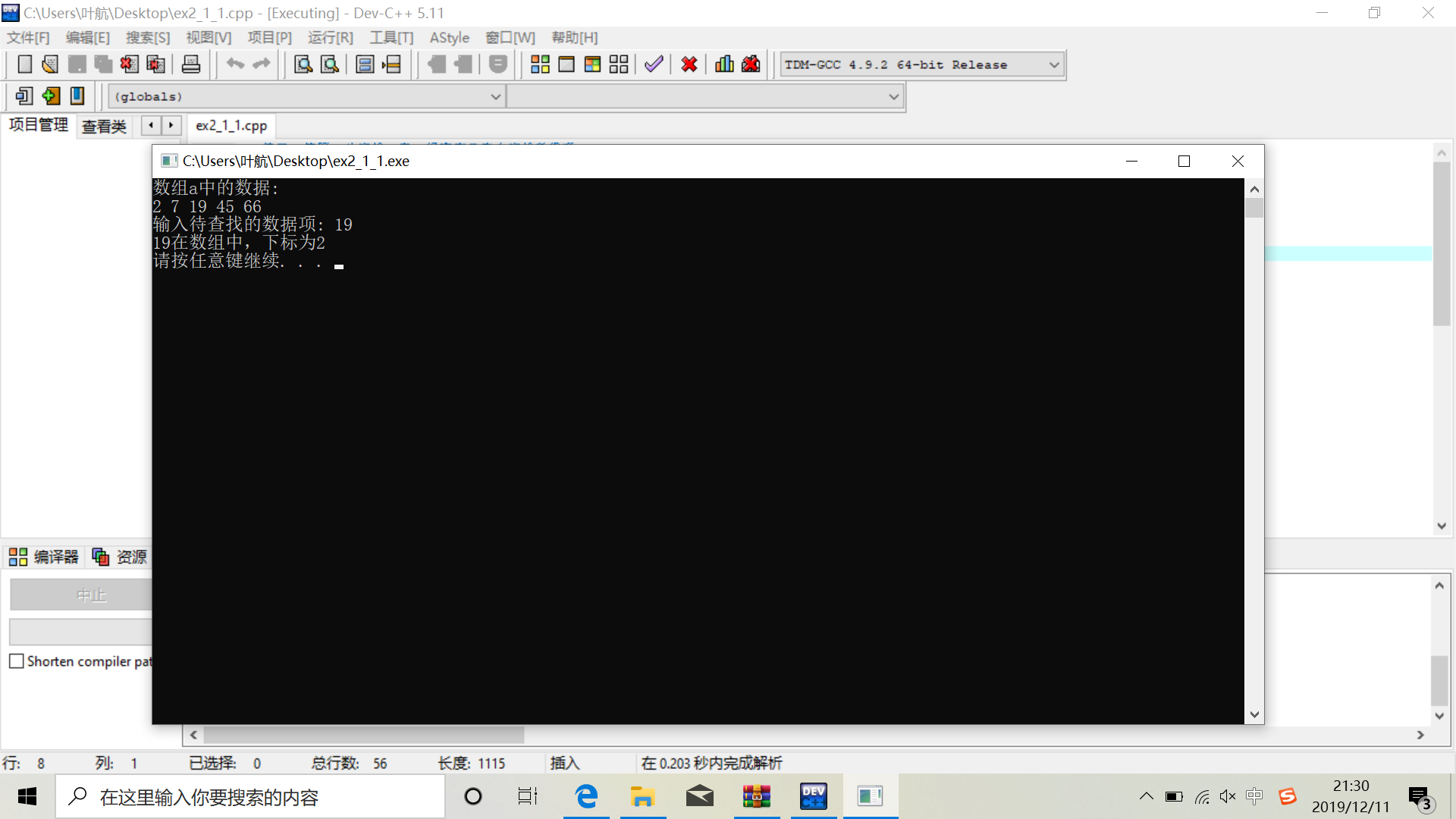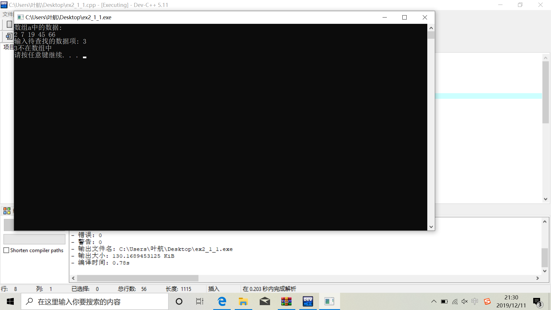 // 练习:使用二分查找,在一组有序元素中查找数据项 // 形参是数组,实参是数组名 #include <stdio.h> #include <stdlib.h> const int N=5; int binarySearch(int x[], int n, int item); // 函数声明 int main() { int a[N]={2,7,19,45,66}; int i,index, key; printf("数组a中的数据:\n"); for(i=0;i<N;i++) printf("%d ",a[i]); printf("\n"); printf("输入待查找的数据项: "); scanf("%d", &key); // 调用函数binarySearch()在数组a中查找指定数据项item,并返回查找结果给index // 补足代码① // ××× index=binarySearch(a,5,key); if(index>=0) printf("%d在数组中,下标为%d\n", key, index); else printf("%d不在数组中\n", key); system("pause"); return 0; } //函数功能描述: //使用二分查找算法在数组x中查找特定值item,数组x大小为n // 如果找到,返回其下标 // 如果没找到,返回-1 int binarySearch(int x[], int n, int item) { int low, high, mid; low = 0; high = n-1; while(low <= high) { mid = (low+high)/2; if (item == x[mid]) return mid; else if(item<high) high = mid - 1; else low = mid + 1; } return -1; }