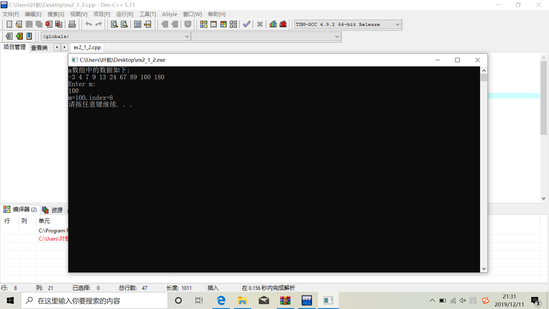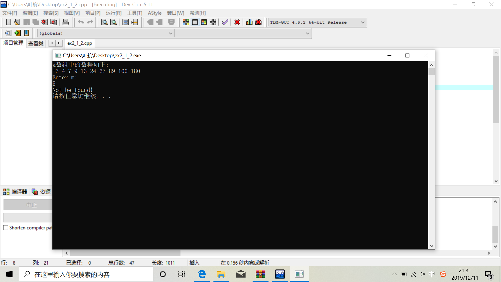 /* N个字典序的整数已放在一维数组中,给定下列程序中,函数fun的功能是: 利用折半查找算法查找整数m在数组中的位置。 若找到,则返回其下标值;反之,则返回-1 */ #include <stdio.h> #include <stdlib.h> #define N 10 int fun(int *a,int m) { int low = 0, high = N-1, mid; /*************ERROR**************/ while(low< high) { mid = (low+high)/2; /*************ERROR**************/ if(m < *(a+mid)) high = mid-1; /*************ERROR**************/ else if(m >*(a+mid)) low = mid+1; else return(mid); } return(-1); } int main() { int i,a[N]={-3,4,7,9,13,24,67,89,100,180},k,m; printf("a数组中的数据如下:\n"); for(i=0;i<N;i++) printf("%d ",a[i]); printf("\nEnter m: \n"); scanf("%d",&m); /*************ERROR**************/ k = fun(a,m); if (k>=0) printf("m=%d,index=%d\n",m,k); else printf("Not be found!\n"); system("pause"); return 0; }
