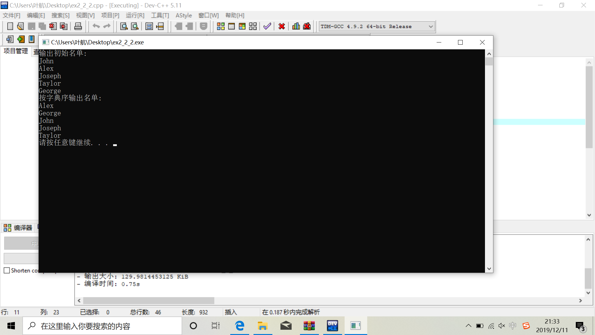 // 练习:使用选择法对字符串按字典序排序 #include <stdio.h> #include <string.h> #include <stdlib.h> void selectSort(char str[][20], int n ); // 函数声明,形参str是二维数组名 int main() { char name[][20] = {"John", "Alex", "Joseph", "Taylor", "George"}; int i; printf("输出初始名单:\n"); for(i=0; i<5; i++) printf("%s\n", name[i]); selectSort(name, 5); // 调用选择法对name数组中的字符串排序 printf("按字典序输出名单:\n"); for(i=0; i<5; i++) printf("%s\n", name[i]); system("pause"); return 0; } // 函数定义 // 函数功能描述:使用选择法对二维数组str中的n个字符串按字典序排序 void selectSort(char str[][20], int n) { // 补足代码 // ××× int i,j,k; char t[20]; for(i=0;i<=n-1;i++) { k=i; for(j=i+1;j<=n-1;j++) if(strcmp(str[j],str[k])<0) k=j; if(n!=k) { strcpy(t,str[i]); strcpy(str[i],str[k]); strcpy(str[k],t); } }}