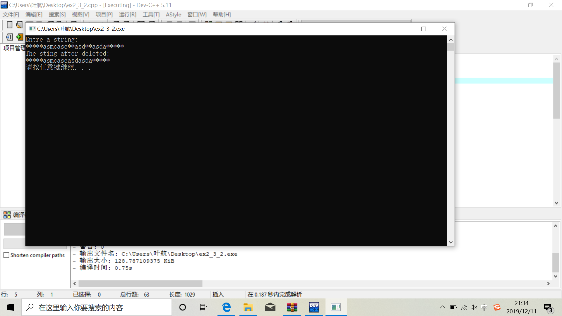/* 假定输入的字符串中只包含字母和*号。 编写函数,实现: 除了字符串前导和尾部的*号之外,将串中其他*号全部删除。 在编写函数时,不得使用C语言提供的字符串函数。 例如,若字符串中的内容为****A*BC*DEF*G******* 删除后,字符串中的内容则应当是****ABCDEFG****** */ #include <stdio.h> #include <stdlib.h> #include <string.h> void fun(char *a) { /**ERROR******/ int i=0; char *t = a, *f = a; char *q = a; while(*t) t++; t--; while(*t == '*') t--; while(*f == '*') f++; /***ERROR***/ while (q<f) { a[i] = *q; q++; i++; } while (q<t) { /***ERROR**/ if(*q != '*') { a[i] = *q; i++; } q++; } while (*q) { a[i] = *q; i++; q++; } /**ERROR**/ a[i]='\0'; } int main () { char s[81]; printf("Entre a string:\n"); gets(s); /**ERROR**/ fun(s); printf("The sting after deleted:\n"); puts(s); system("pause"); return 0; }