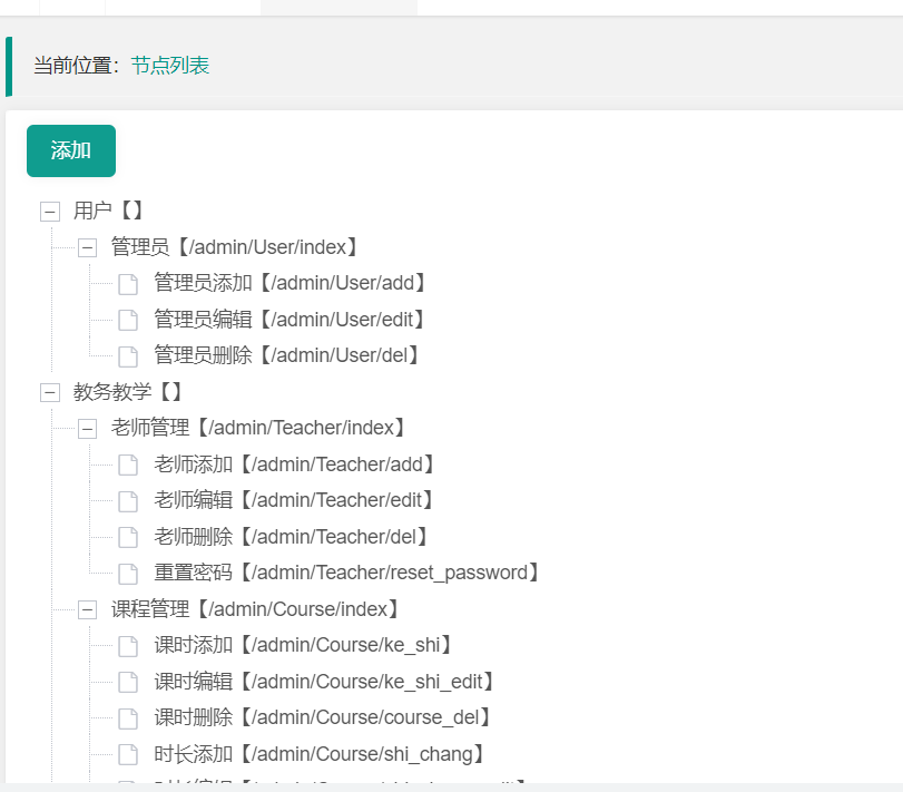 { "result": [ { "title": "用户【】", "id": 1, "field": "", "spread": true, "children": [ { "title": "管理员【/admin/User/index】", "id": 2, "field": "", "spread": true, "checked": true, "children": [ { "title": "管理员添加【/admin/User/add】", "id": 3, "field": "", "spread": true, "checked": true }, { "title": "管理员编辑【/admin/User/edit】", "id": 4, "field": "", "spread": true, "checked": true }, { "title": "管理员删除【/admin/User/del】", "id": 5, "field": "", "spread": true, "checked": true } ] } ] }, { "title": "教务教学【】", "id": 6, "field": "", "spread": true, "children": [ { "title": "老师管理【/admin/Teacher/index】", "id": 7, "field": "", "spread": true, "checked": true, "children": [ { "title": "老师添加【/admin/Teacher/add】", "id": 18, "field": "", "spread": true, "checked": true }, { "title": "老师编辑【/admin/Teacher/edit】", "id": 19, "field": "", "spread": true, "checked": true }, { "title": "老师删除【/admin/Teacher/del】", "id": 20, "field": "", "spread": true, "checked": true }, { "title": "重置密码【/admin/Teacher/reset_password】", "id": 21, "field": "", "spread": true, "checked": true } ] }, { "title": "课程管理【/admin/Course/index】", "id": 8, "field": "", "spread": true, "checked": true, "children": [ { "title": "课时添加【/admin/Course/ke_shi】", "id": 35, "field": "", "spread": true, "checked": true }, { "title": "课时编辑【/admin/Course/ke_shi_edit】", "id": 36, "field": "", "spread": true, "checked": true }, { "title": "课时删除【/admin/Course/course_del】", "id": 37, "field": "", "spread": true, "checked": true }, { "title": "时长添加【/admin/Course/shi_chang】", "id": 38, "field": "", "spread": true, "checked": true }, { "title": "时长编辑【/admin/Course/shi_chang_edit】", "id": 39, "field": "", "spread": true, "checked": true }, { "title": "时长删除【/admin/Course/course_del】", "id": 40, "field": "", "spread": true, "checked": true }, { "title": "一对一添加【/admin/Course/yi_dui_yi】", "id": 41, "field": "", "spread": true, "checked": true }, { "title": "一对一编辑【/admin/Course/yi_dui_yi_edit】", "id": 42, "field": "", "spread": true, "checked": true }, { "title": "一对一删除【/admin/Course/course_del】", "id": 43, "field": "", "spread": true, "checked": true }, { "title": "课次添加【/admin/Course/ke_ci】", "id": 44, "field": "", "spread": true, "checked": true }, { "title": "课次编辑【/admin/Course/ke_ci_edit】", "id": 45, "field": "", "spread": true, "checked": true }, { "title": "课次删除【/admin/Course/course_del】", "id": 46, "field": "", "spread": true, "checked": true } ] }, { "title": "报名【/admin/Signup/index】", "id": 9, "field": "", "spread": true, "checked": true }, { "title": "学员管理【/admin/Student/index】", "id": 15, "field": "", "spread": true, "checked": true } ] }, { "title": "角色管理【】", "id": 10, "field": "", "spread": true, "children": [ { "title": "角色列表【/admin/Roles/index】", "id": 11, "field": "", "spread": true, "checked": true, "children": [ { "title": "添加角色【/admin/Roles/add】", "id": 22, "field": "", "spread": true, "checked": true }, { "title": "编辑角色【/admin/Roles/edit】", "id": 23, "field": "", "spread": true, "checked": true }, { "title": "删除角色【/admin/Roles/del】", "id": 24, "field": "", "spread": true, "checked": true }, { "title": "授权【/admin/Roles/node_list】", "id": 25, "field": "", "spread": true, "checked": true } ] } ] }, { "title": "节点管理【】", "id": 12, "field": "", "spread": true, "children": [ { "title": "节点列表【/admin/Node/index】", "id": 13, "field": "", "spread": true, "checked": true }, { "title": "节点添加【/admin/Node/add】", "id": 14, "field": "", "spread": true, "checked": true } ] }, { "title": "系统设置【】", "id": 16, "field": "", "spread": true, "children": [ { "title": "学校管理设置【/admin/Schoolmanager/index】", "id": 17, "field": "", "spread": true, "checked": true, "children": [ { "title": "科目添加【/admin/Schoolmanager/subject】", "id": 26, "field": "", "spread": true, "checked": true }, { "title": "科目删除【/admin/Schoolmanager/subject_del】", "id": 27, "field": "", "spread": true, "checked": true }, { "title": "科目编辑【/admin/Schoolmanager/subject_edit_form】", "id": 28, "field": "", "spread": true, "checked": true }, { "title": "年级添加【/admin/Schoolmanager/grade】", "id": 29, "field": "", "spread": true, "checked": true }, { "title": "年级编辑【/admin/Schoolmanager/grade_edit_form】", "id": 30, "field": "", "spread": true, "checked": true }, { "title": "年级删除【/admin/Schoolmanager/grade_del】", "id": 31, "field": "", "spread": true, "checked": true }, { "title": "教室添加【/admin/Schoolmanager/room】", "id": 32, "field": "", "spread": true, "checked": true }, { "title": "教室编辑【/admin/Schoolmanager/room_edit_form】", "id": 33, "field": "", "spread": true, "checked": true }, { "title": "教室删除【/admin/Schoolmanager/room_del】", "id": 34, "field": "", "spread": true, "checked": true } ] } ] } ] }