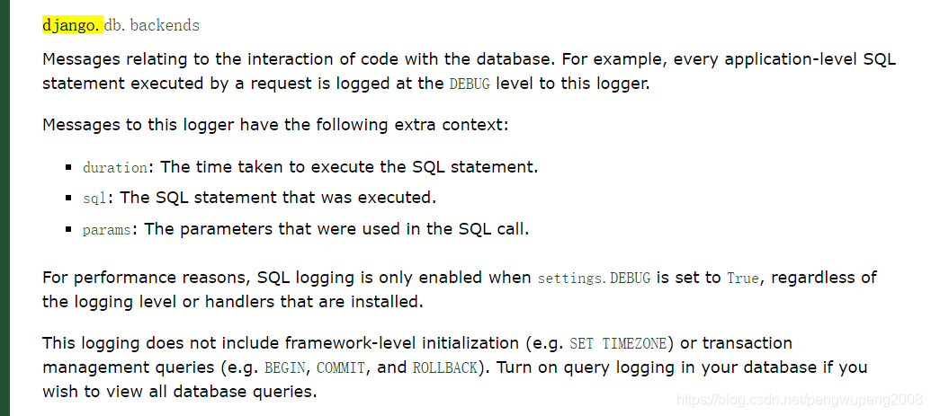 LOGGING = { 'version': 1, 'disable_existing_loggers': False, 'handlers': { 'console':{ 'level':'DEBUG', 'class':'logging.StreamHandler', }, }, 'loggers': { 'django.db.backends': { 'handlers': ['console'], 'propagate': True, 'level':'DEBUG', }, } }