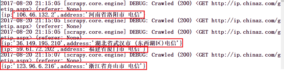 上面的代码中,url = 'http://ip.chinaz.com/getip.aspx'这个网站可以显示我们的ip地址,我们用它来测试,请注意,在Request()中,我们必须添加dont_filter=True因为我们多次请求的是同一个网址,scrapy默认会把重复的网址过滤掉。运行这个项目,我们可以看到如下的输出。