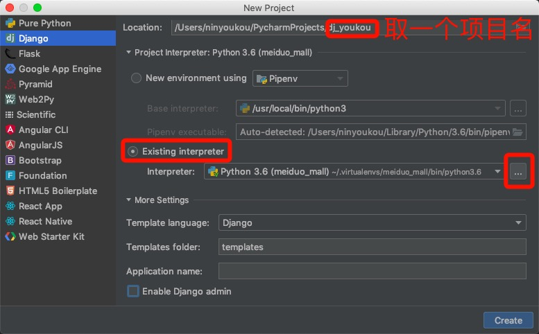 2、在pycharm中新建项目,取名、添加虚拟机上的虚拟环境