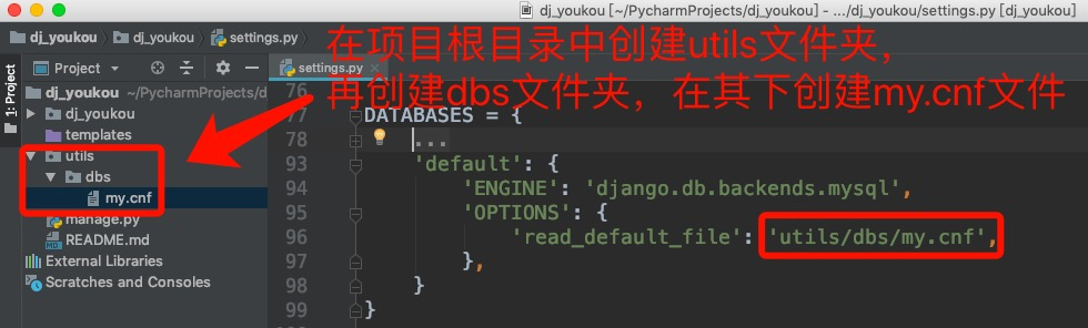 DATABASES = { # 方法二: 'default': { 'ENGINE': 'django.db.backends.mysql', 'OPTIONS': { 'read_default_file': 'utils/dbs/my.cnf', }, } }