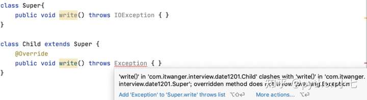 2)重写后的方法不能抛出比父类中更高级别的异常。举例来说,如果父类中的方法抛出的是 IOException,那么子类中重写的方法不能抛出 Exception,可以是 IOException 的子类或者不抛出任何异常。这条规则只适用于可检查的异常。