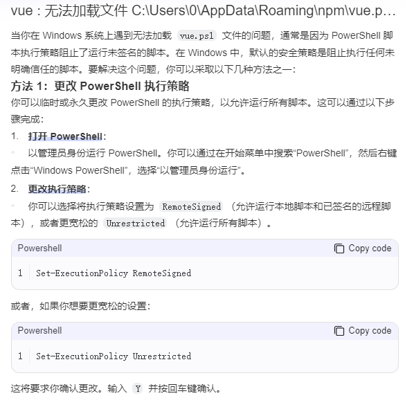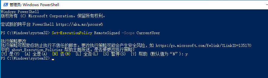 powershellCopy CodeSet-ExecutionPolicy RemoteSigned -Scope CurrentUser这条命令会将当前用户的PowerShell执行策略设置为