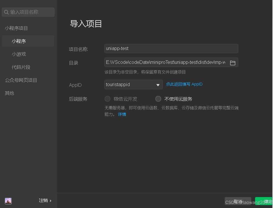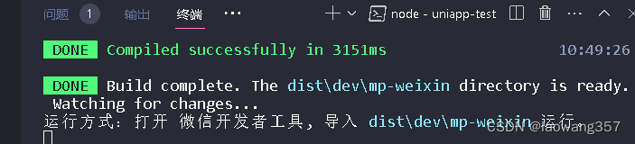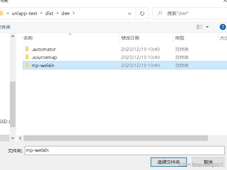 然后打开这个目录,我的项目名称是uniapp-test,找到dist路径下的dev:E:\VScode\codeDate\miniproTest\uniapp-test\dist\dev
