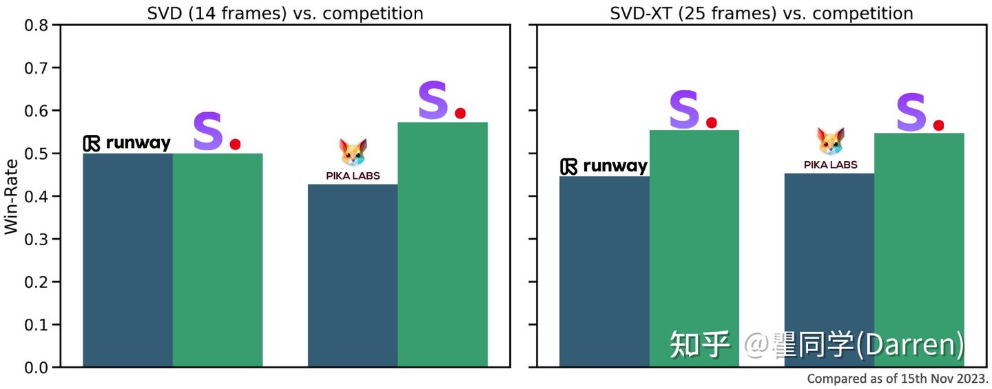 The chart above evaluates user preference for SVD-Image-to-Video over GEN-2 and PikaLabs. SVD-Image-to-Video is preferred by human voters in terms of video quality. For details on the user study, we refer to the research paper