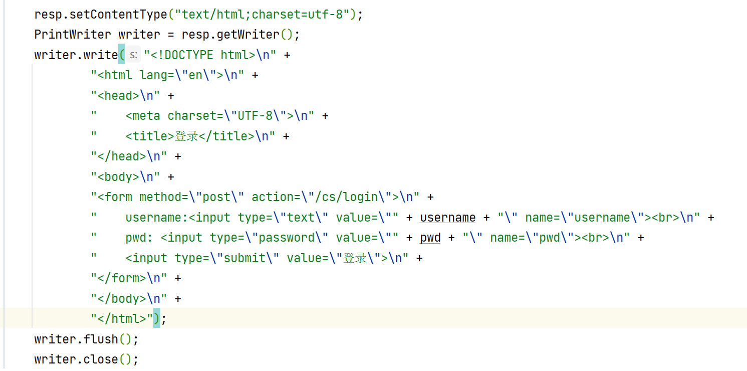 最开始,我们是通过 servlet 的输出流直接返回 HTML 的,但是有一个问题就是这样返回动态页面会使得代码的可读性极差,很难进行排版,维护起来会很麻烦。(如下图)