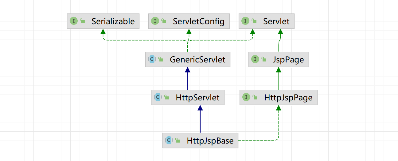 解读: - 这就一目了然了,HttpJspBase 继承了 HttpServlet,实现了 HttpJspPage,所以 JSP 就是一个 Servlet,而且功能比原生的 Servlet 还要全面很多;